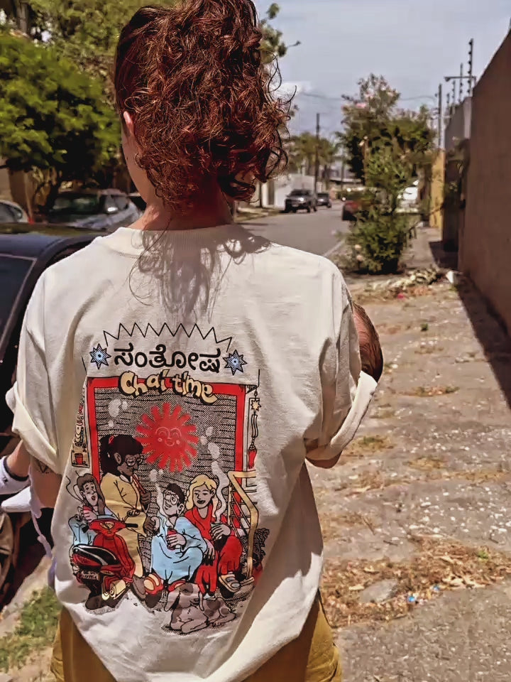 Foi dessa atmosfera que nasceu a Chai Time, criada em colaboração com o artista visual Bens para a coleção de 5 anos da Santosha. Sua estampa traduz a leveza desse momento: um desenho contemporâneo, lúdico e cheio de cores, que une a tradição indiana ao olhar urbano e moderno da arte atual.